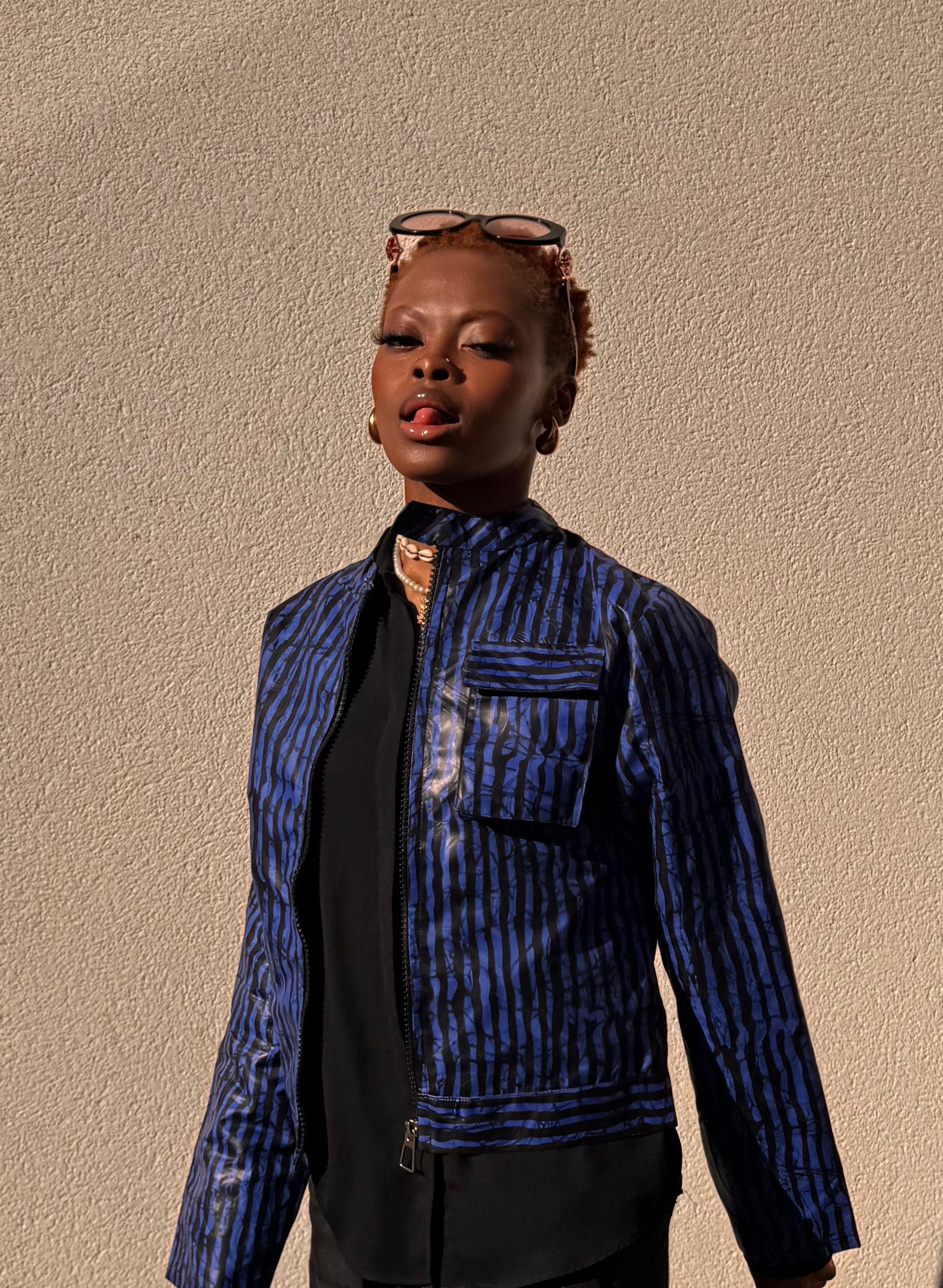 A sharp silhouette, softened by tradition. This lightweight biker-style jacket is made from lined Adire batik fabric, dyed in rich purple tones with a classic vertical stripe. It’s a confident staple with subtle, thoughtful details.