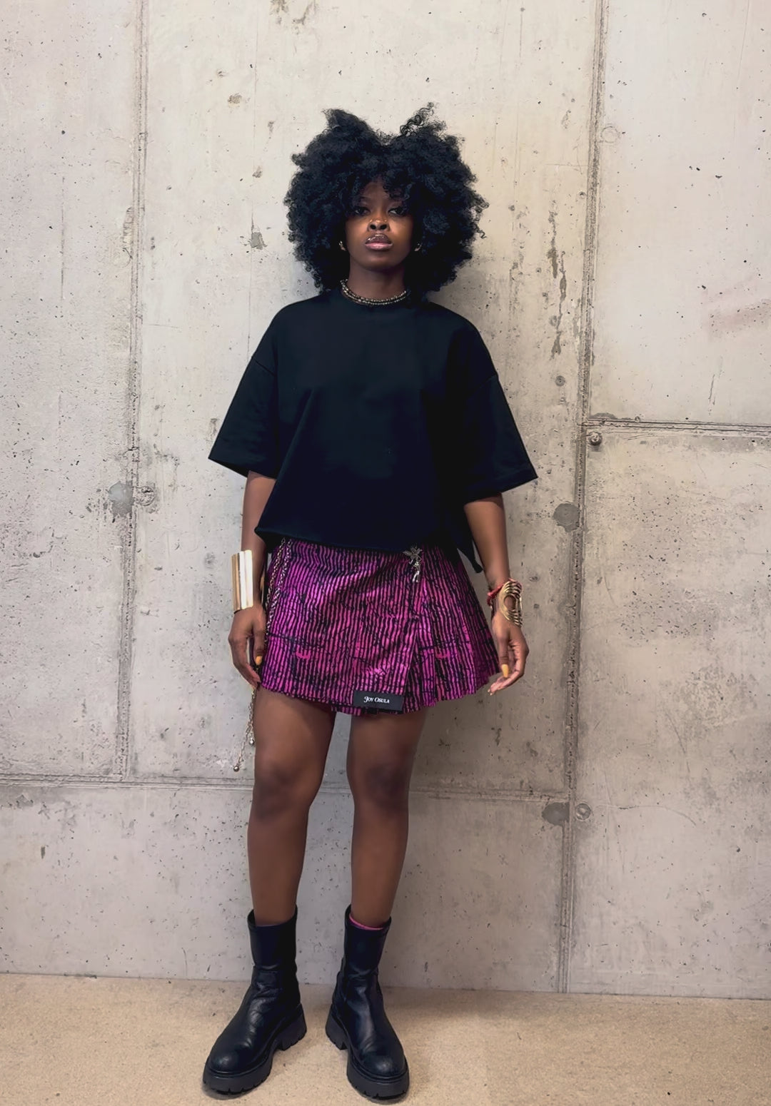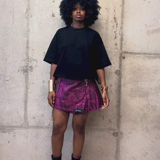 Made from Adire print inspired fabric with a lightweight cotton linen base, this skirt brings a touch of bold energy to everyday styling. The pleats add movement, while the vibrant pink print makes a statement.