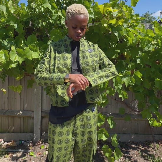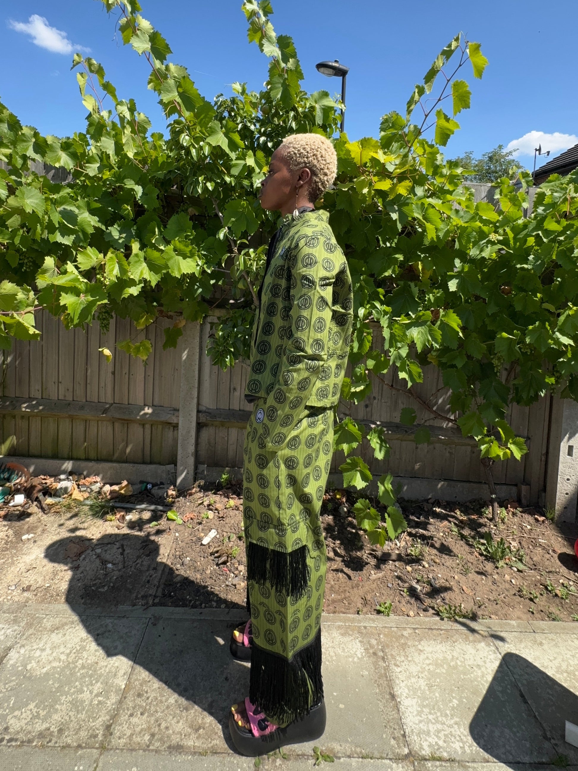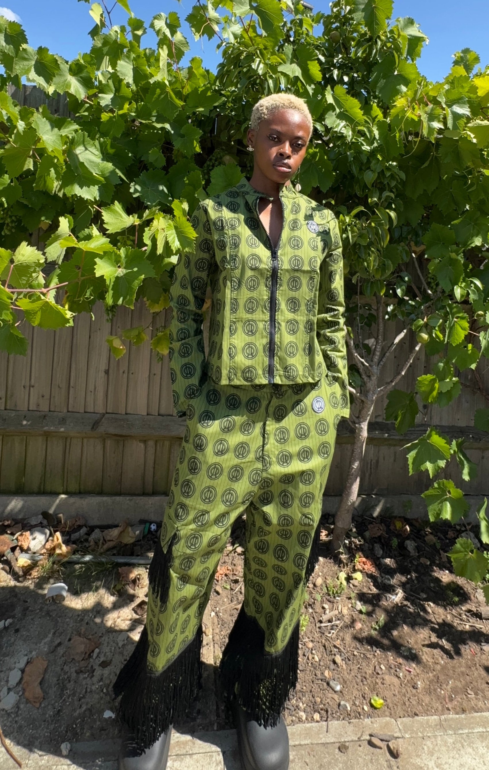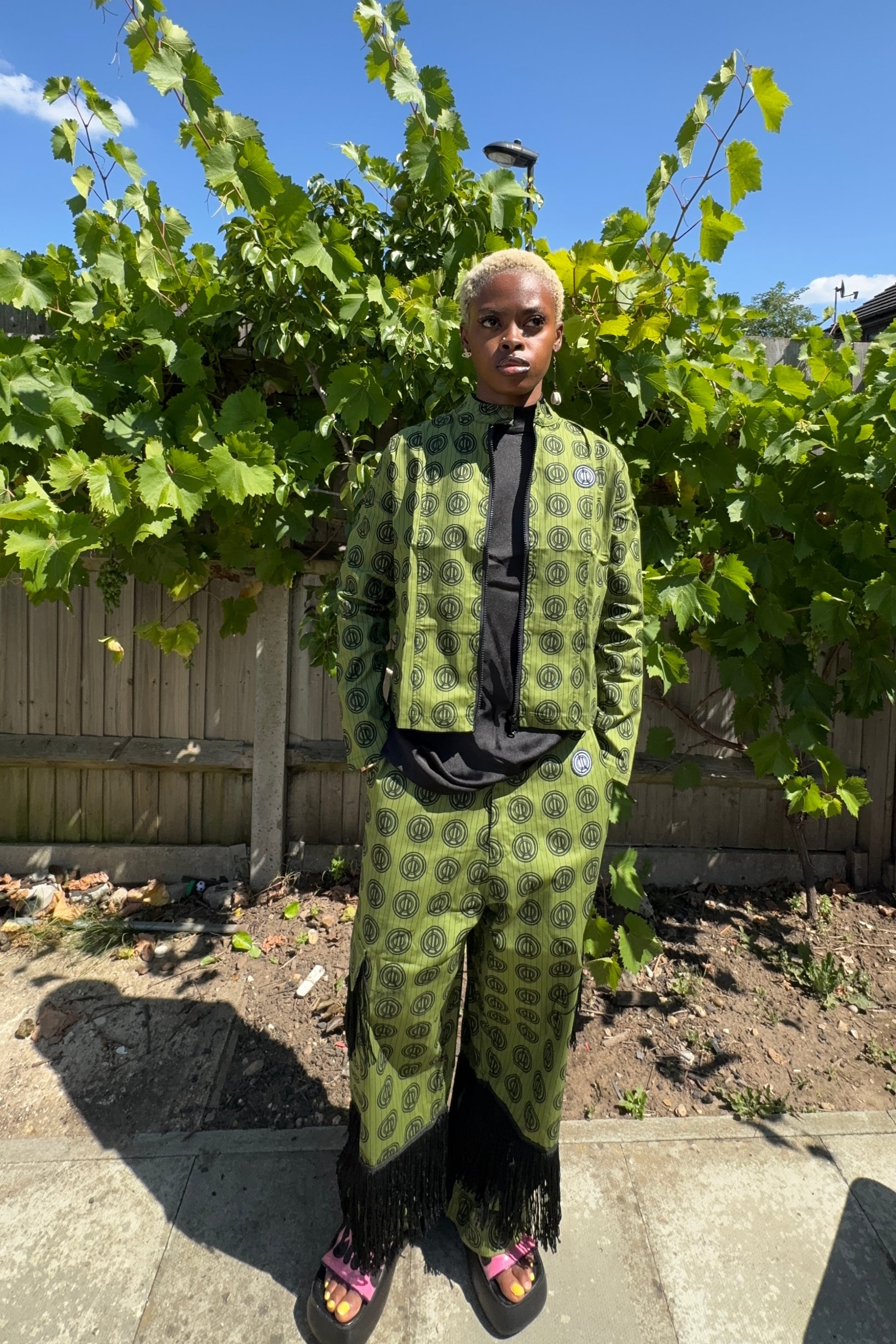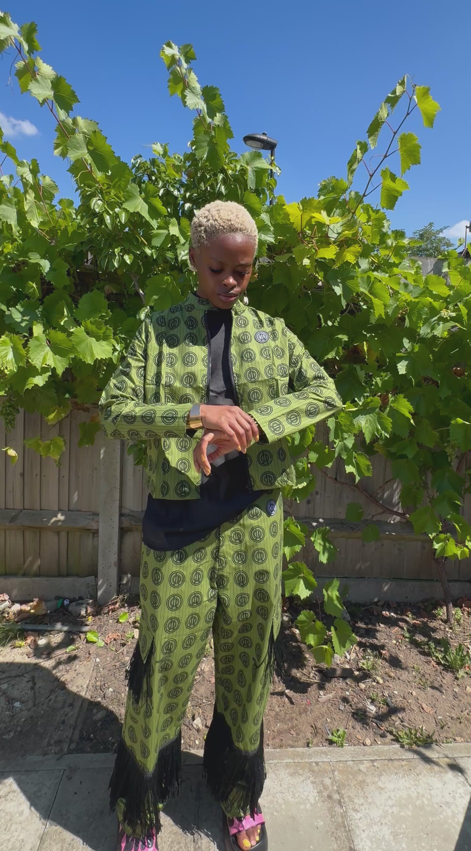 The JOMO set is a bold uniform of joy, jacket and trousers in the Joy Motif print, cut for structure, comfort, and movement. Finished with fringe detailing, it’s heritage with a twist of streetwear attitude.