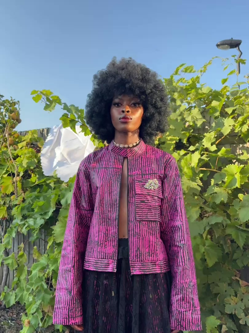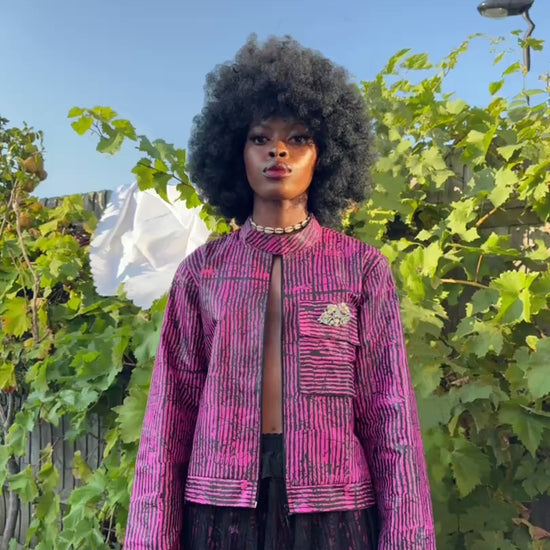 Bold, modern tailoring and rooted in heritage. This biker style jacket is crafted from vibrant hand-dyed Adire fabric in striking pink and black striping; a statement piece made for standout moments.